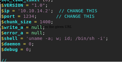 - Copy the PHP reverse shell from Kali to the operating folder as shell.php and change the IP field.