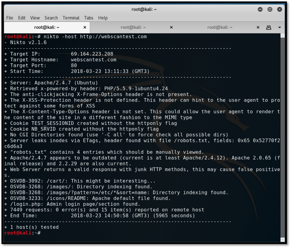 We shall now use Nikto to scan http://webscantest.com which is a website intentionally left vulnerable for testing web application vulnerabilities. Typing on the terminal “nikto” displays basic usage options.