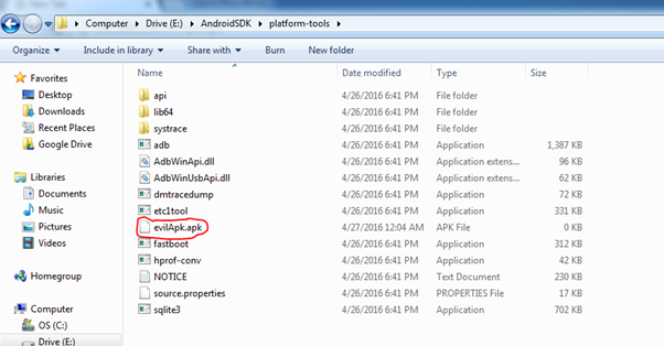 Open the URL: http://192.168.1.9/evilAndroid.apk in your Windows VMs browser and copy the apk to the platform-tools folder of Android SDK.