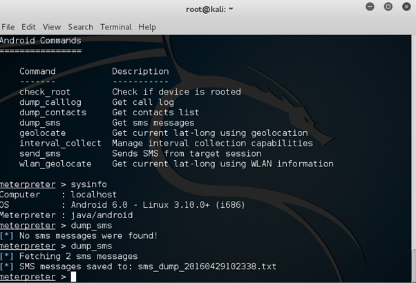 dump_sms command dumps SMS into a text file on your Kali Linux home directory. Let's have a look at that command in the below screenshots.