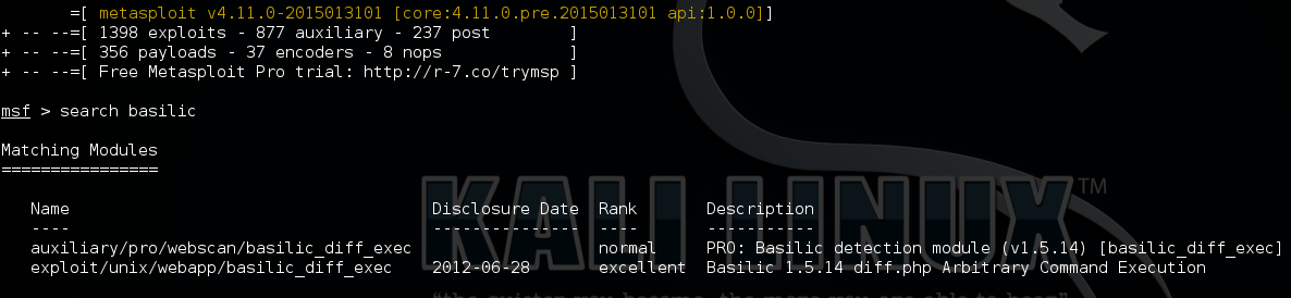 As seen above there are many frameworks installed for exploitation. We will be working with Basilic 1.5.14 in this article.