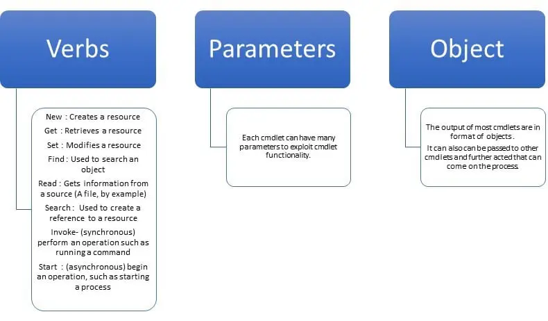 As we can see, Cmdlets represent simply small scripts that follow a dash-separated verb-noun convention as "Start-Process" or "Stop-Process." We can remark that we can found Verbs with Different Actions. The structure of Cmdlets can be represented as the following :