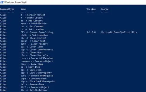 Then we will try to get all aliases for current session using "Get-Alias" :