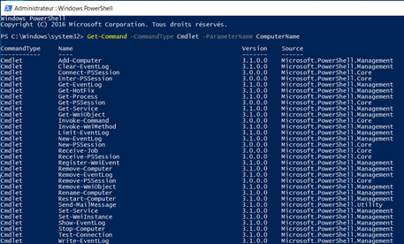 For our first example, we will simply execute commands remotely without creating a session. We can achieve this by using cmdlets that support remoting. We can identify them by searching cmdlets with Parameter: ComputerName like we can see in the following screenshot: