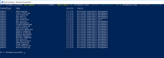 Unfortunately, we will have some cmdlets that are related to sessions, so we will need to define our results to get only cmdlets that can be executed on target machine(s). We can do this by using a loop that will only get cmdlets that are not related to sessions, as we can see in the following screenshot: