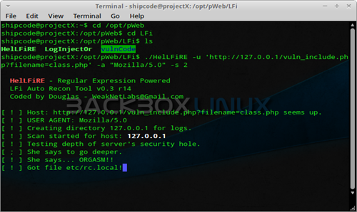 ./HelLFiRE -u 'http://127.0.0.1/vuln_include.php?filename=class.php' -a "Mozilla/5.0″ -s 2
