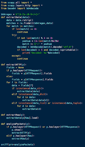 Using scapy, it is trivial to decode the traffic used for protocol tunneling. The analyzePackets function checks to see if a particular packet is an HTTP packet or carries data. If HTTP, all fields are extracted and sent for analysis, and the payload of any raw packet is analyzed as well.