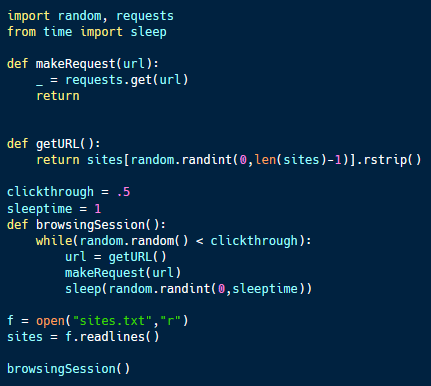 To do this, the code draws from a list of URLs that the employee may visit. At random intervals, the code will request a site from the list. The code also has a probability of clickthrough or visiting multiple sites during a session. When a session is complete the program sleeps for a random period until the next session starts.