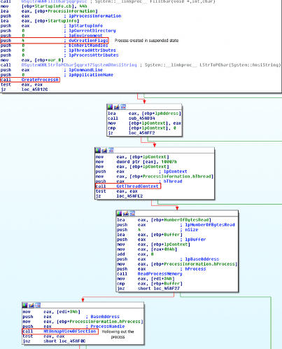 The process hollowing technique creates a suspended state (CREATE_SUSPENDED (0x00000004)), unmapping its memory and replacing it with the target code. In detail, the target process can be created using the CreateProcess call with the suspended flag to suspend the main thread. After this point, the memory of the created process is unmapped using Win32 calls such as ZwUnmapViewOfSection and NtUnmapViewOfSection. Next, the new code is injected and realigned using VirtualAllocEx and WriteProcessMemory calls. Finally, the main thread is resumed using the ResumeThread call.