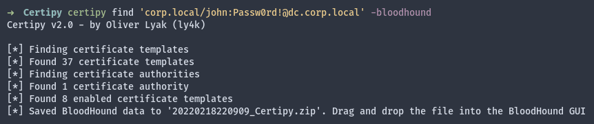 Figure 1: Details about the AD CS obtained and compiled into a zip format to be imported into the BloodHound tool.