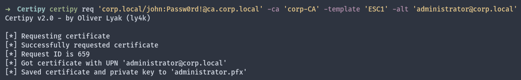 This path checks if the target certificate allows “Client Authentication” and if any SAN can be specified. A potential attack via ESC-1 can be executed, as demonstrated below.