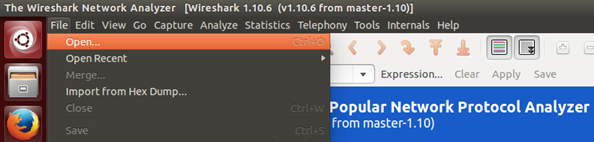 How about the .pcap files? We can use Wireshark, a popular network protocol analyzer, to examine those. Enter sudo wireshark to start the program. Click OK to acknowledge the error/warning messages that pop up. Once at the Wireshark main window, go to File → Open.