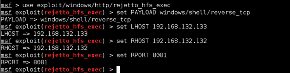 Here we configured an exploit against a vulnerable version of Rejetto HFS HTTP File server that is running on our Windows Server 2012 R2 VM.