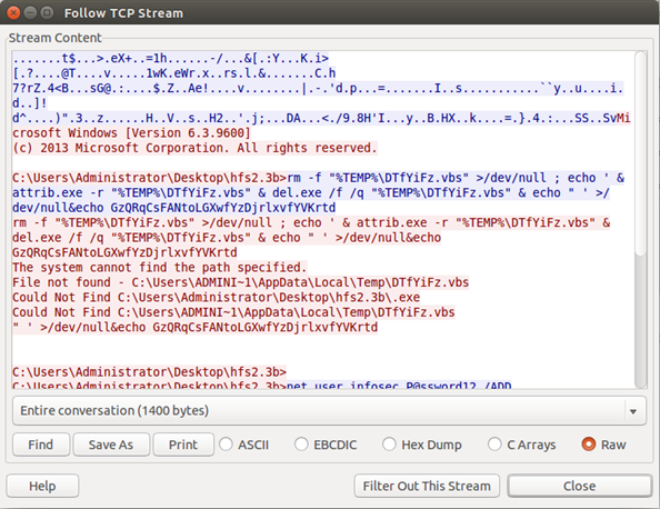 After you’ve verified your results, go ahead and close the stream window. This should take you back to the packet you selected in the beginning. Now hit your up arrow until you see the ASCII part of your hex dump show “C:UsersAdministratorDesktophfs2.3b>” in the bottom pane. See below.