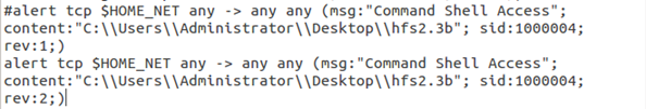 alert tcp $HOME_NET any -> any any (msg:"Command Shell Access"; content:"C:UsersAdministratorDesktophfs2.3b"; sid:1000004; rev:1;)