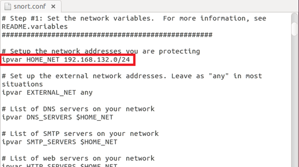 Enter the password for Ubuntu Server. When the snort.conf file opens, scroll down until you find the ipvar HOME_NET setting. You’ll want to change the IP address to be your actual class C subnet. Currently, it should be 192.168.132.0/24. You’ll simply change the IP address part to match your Ubuntu Server VM IP, making sure to leave the “.0/24″ on the end.