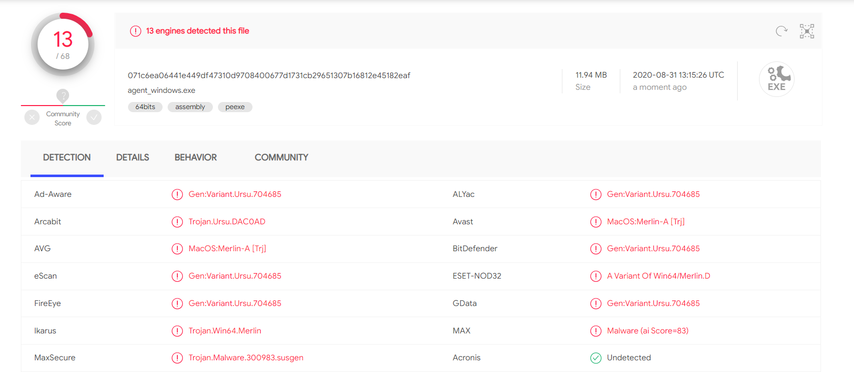 After performing the tests, the sample was submitted to the VirusTotal online sandbox, and only 13 out of 68 AV engines detected the Merlin agent as malicious.