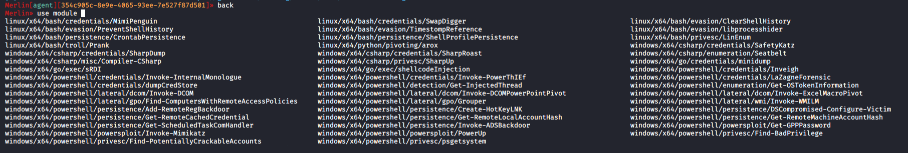 On the Merlin server, a new connection is received as presented below. From here, a set of Windows native commands can be used via the cmd command and several modules, including harvesting, mimikatz, sharphound, credential stealers and even custom-developed modules.
