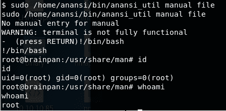 5. Below, we have run the abovementioned anansi_util and it has some parameters. An interesting parameter is manual [command]. We just passed a sample command “file” to it and then type !/bin/bash, and we have escalated to root.