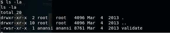 1. There is another binary on the system named validate, as shown below. Notice that this binary is owned by user anansi, so we will almost get the shell under anansi. But we know from Method 1 that there is an interesting utility under user anansi that is running as root.