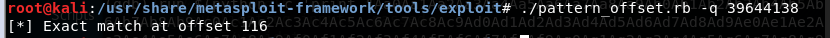 6. From above testing, the seg fault occurs at 0x39644138. Using the pattern_offset utility in Kali Linux to find the exact offset, we can see that the exact offset is at 116.