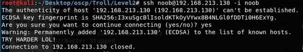 - Let's try to login with this key as user noob… annnnnndddd we got a TRY HARDER LOL!