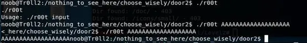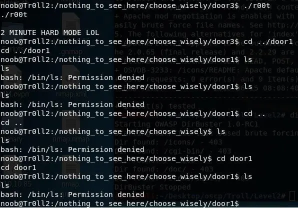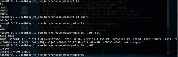 - Executing another file (r00t) in door 3 locks me out for two minutes. You can look at my struggle below.