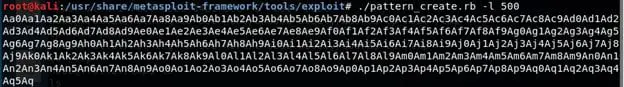 - Following the buffer overflow steps, we're creating a pattern of 500 random characters with pattern_create in Kali.