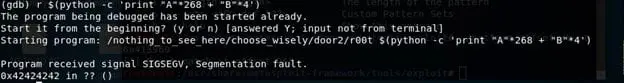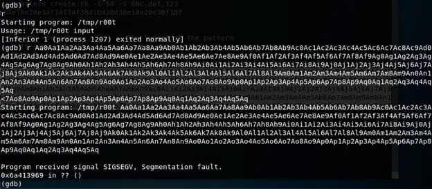 - Debugging the application within GDB shows that the EIP is overwritten by a value (possibly some part of our random characters).