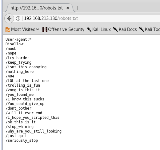 - As is the norm, we ran Nmap scans on all ports (since this is a troll, so not taking any chances). We got hits on 21, 22 and 80 (and robots.txt as well).