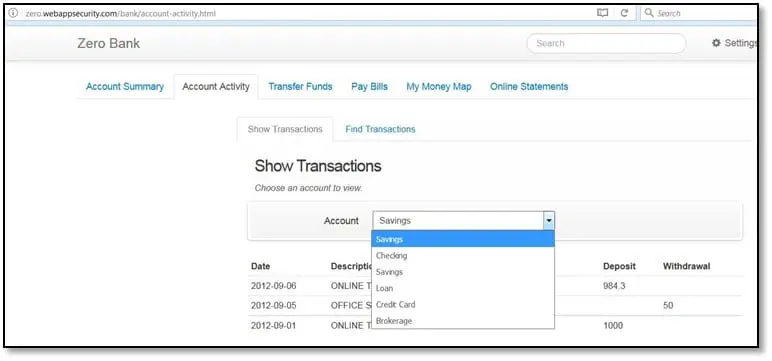 In the logical issues finding we will be focusing on that kind of issues which will generally not found by any automated scanner we are not going to test issues like SQL injection, XSS or any other this kind of issues which generally can be found by running scanner so we are not going to waste out time to finding these kinds of issues. For finding the logical issues first, we must understand the application functionality that what is does when the user triggers that functionality and what will happen if we change the parameter's value. So, we are going to show some testing scenario of some of the functionalities of our target application. Once we logged in into the application, the first functionality we came through was Account summary which was shows details from Account Activity. The account activity shows the transaction details from accounts; now as can be seen below there are five accounts i.e. Savings, Checking, Loan, Credit Card, and Brokerage.
