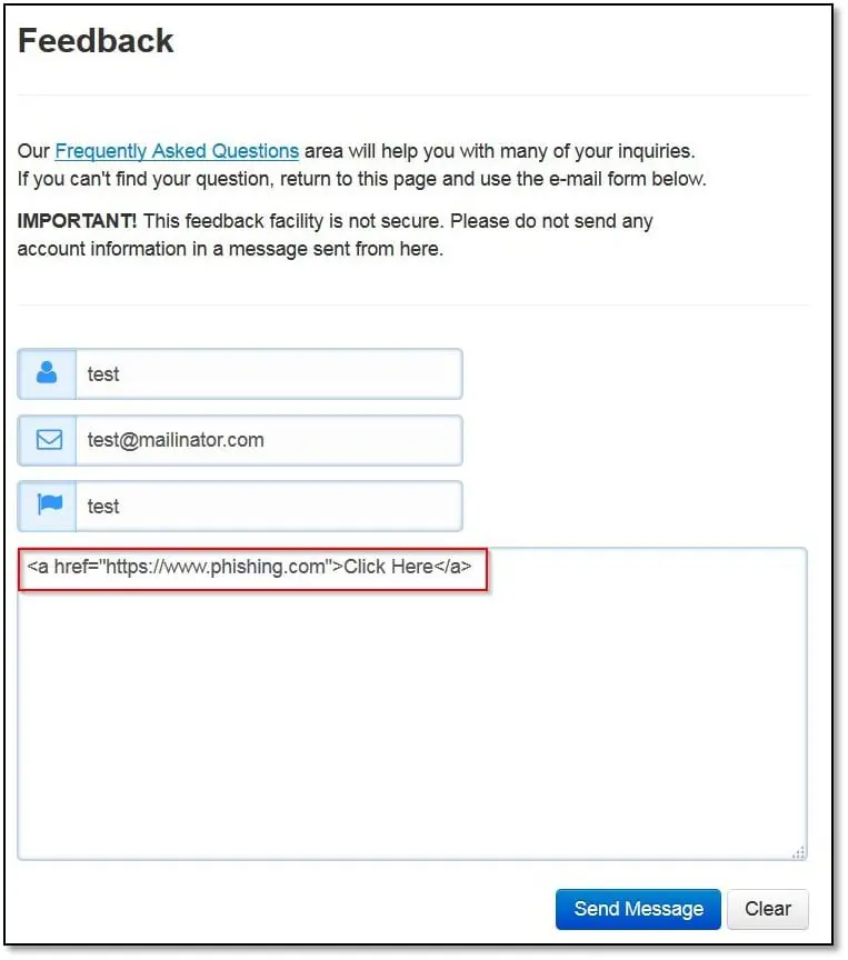 As can be seen above we have submitted <a href="https://www.phishing.com">Click Here</a> and clicked on Send Message, and it got submitted successfully.
