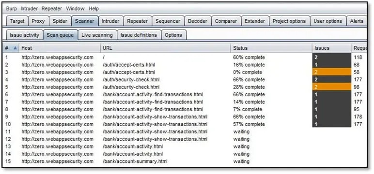 Now Burp Suite will scan all URLs from the scope as can be seen below.
