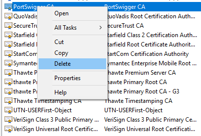If you want to remove the certificate, you can navigate to the same location and right click on the PortSwigger CA certificate and delete. This looks as shown in the following figure.