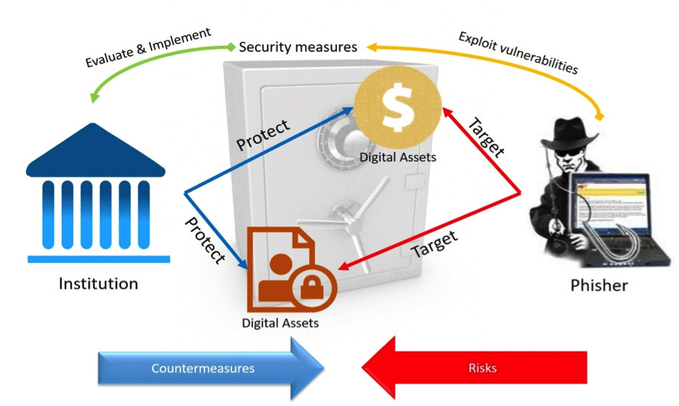 There are four attributes, the three Is and one M, to recognize in threat modeling: identification of assets, threats, and vulnerabilities, plus threat mitigation. The three Is are interrelated, as the digital assets provide considerable clues for the institution to anticipate the threats, motivations, attack patterns, and objectives of the phisher. This eventually contributes to recognizing the vulnerabilities of the internal systems and thus mitigating the risk.