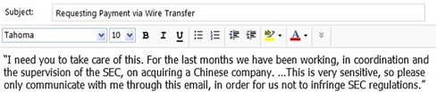 Employee "tasked" to transfer large amounts of moneyOne multi-stage fraud with phishing elements directed towards the middle management is a case from February 2015 that took place in Omaha, Nebraska, within the premises of the commodities trader company The Scoular Co. A spoofed CEO's email was sent to a lower manager while the CEO was travelling, asking the manager in question to transfer a huge amount of money out of the country to a Chinese bank. Here is some of text from the deceitful email: