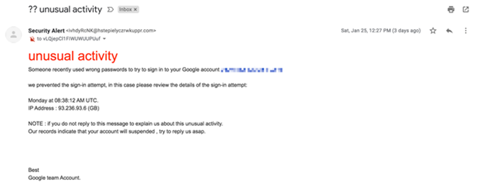 In this example, the sender is asking the user to submit an explanation for unusual activity on their account on an urgent basis. If he or she doesn’t, the account will be suspended.