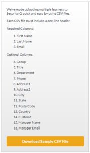 There are two quick and easy methods for enrolling learners in SecurityIQ. If you only need to add one or two learners, you can create them manually. In certain situations, however, such as enrolling a large number of learners during the setup process or as part of seasonal hiring, it is more convenient to enroll multiple learners at once, which can be done by importing a comma separated (CSV) file. We will cover both methods.