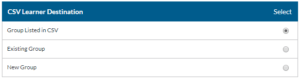 - Group Listed in CSV - This option will use the group listed in the CSV file. If no group is listed the learner will not be added to any group.