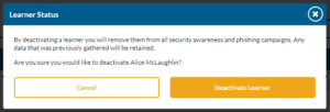 By deactivating a learner you will remove them from all PhishSim and AwareEd campaigns. The learners data will be retained in your SecurityIQ platform. The learner will still count against your learner total count.