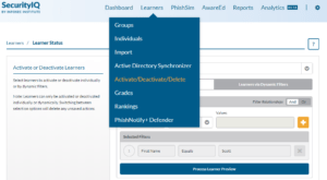 By deactivating a learner you will remove them from all PhishSim and AwareEd campaigns. The learners data will be retained in your SecurityIQ platform. The learner will still count against your learner total count. You can select multiple users to activate or deactivate by navigating to the Deactivate/Activate section of your SecurityIQ platform under Learners.