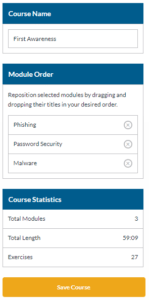 When designing a security awareness training campaign, you will likely want to tailor the training to be as effective as possible for each role within your company. As an example, a portion of your staff may need to receive training on basic security practices as well as training on HIPAA compliance while another set of employees may do a lot of work remotely and need to receive training related operating securely in a public or remote environment but do not require HIPAA training. Courses allow you to create different collections of individual training modules which can then be assigned to differing groups of learners through a campaign.