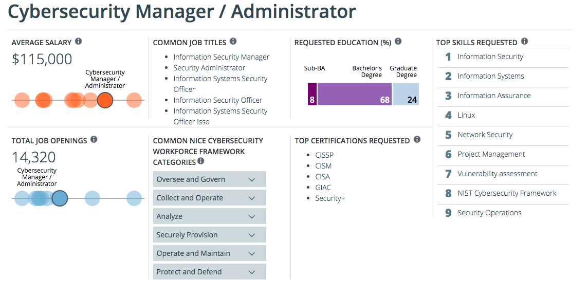 Cybersecurity is a complex and growing field, so the National Initiative for Cybersecurity Education (NICE) created a helpful framework to organize cybersecurity jobs by core duties and technical skills. For each job in the CyberSeek tool, you can do a deep dive into which NICE skill clusters are associated with each role. Here’s what it has to say about cybersecurity managers/administrators: