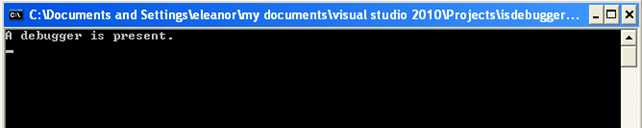 If we compile and run the program now under the Visual Studio debugger, the program will print a statement about the debugger being present, as we can see on the picture below: