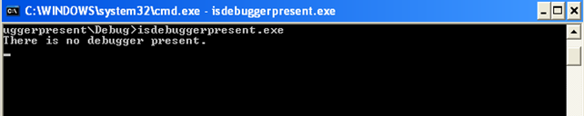 This is ok and proves that the above code works as expected, since it was clearly able to identify that a debugger is present. But if we copy the compiled executable to Desktop and run that executable in cmd.exe, we can see that the program will print the statement about the debugger not being present; we can see this on the picture below: