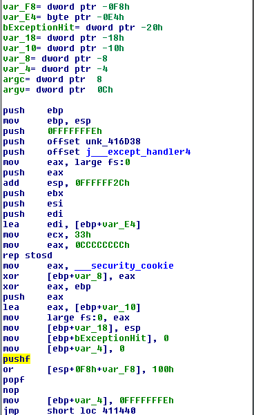 In the main function, we first initialize the stack, but that's really not important at the moment. What's important is the assembly instruction from the C source code; we can see them on the picture above (notice the pushf instruction and the following 3 instructions). Those are exactly the instructions we've inputted in the C source code in the __asm block.