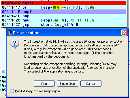 When we tried to execute the popf instruction, a new window pops up, notifying us that the instruction at address 0x41141E (which is exactly the popf instruction) is trying to set the trace bit in the flags register. Here we have a choice of either setting the trace bit, in which case we're telling Ida to handle the exception by itself, so the program's exception handler will not be invoked. If we press Run, we're telling Ida to ignore setting the trace bit and instead generate an exception, which will successfully invoke the program's exception handler routine and set the bExceptionHit to true.